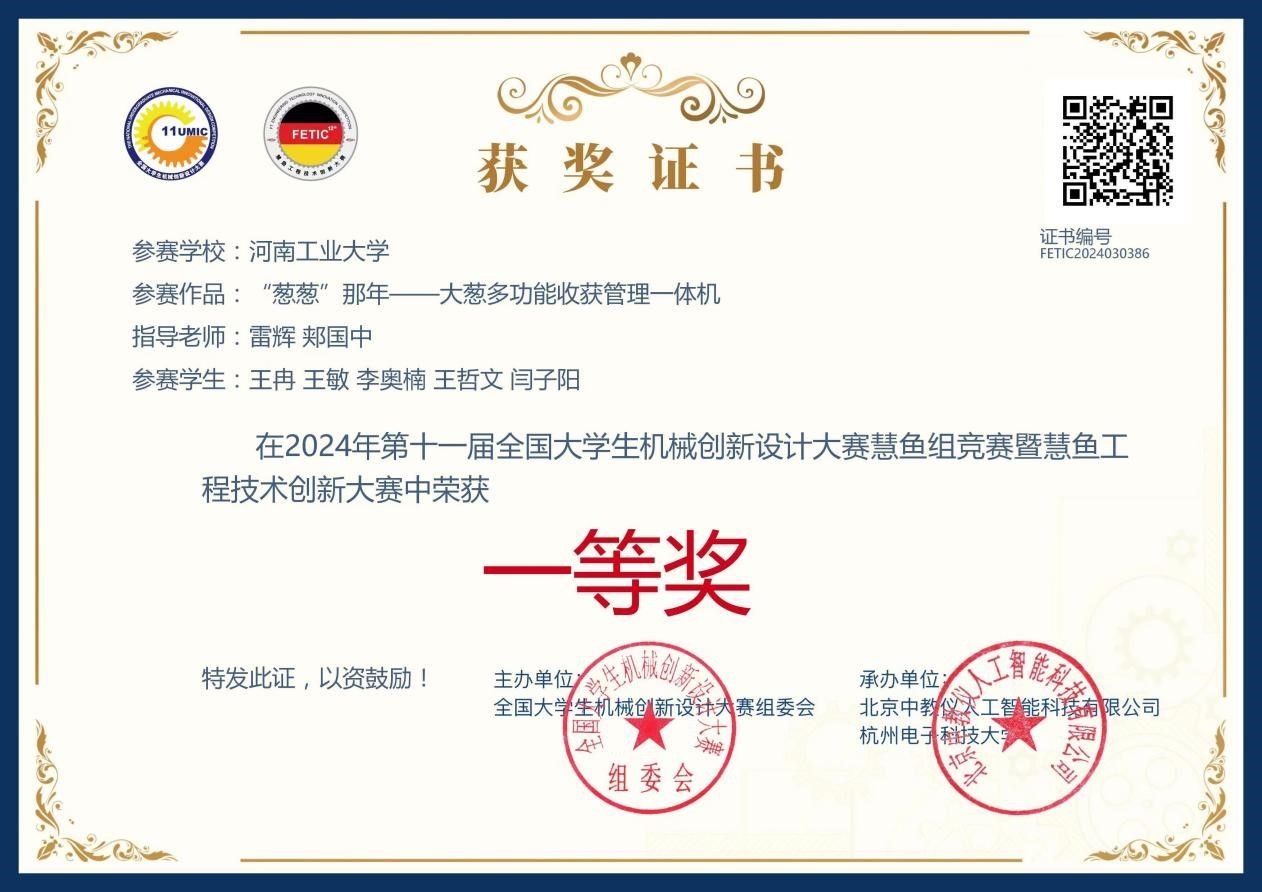 雷辉、郏国中老师指导,赵一墨、王冉等10位同学设计的两项作品:“小米神农-—智能谷子收播一体化小型农机”和“葱葱那年—大葱多功能收获管理一体机”,在与浙江大学、西安交通大学、哈尔滨工业大学、华中科技大学等全国170余所高校740多件作品的角逐中脱颖而出,均斩获全国一等奖的好成绩。