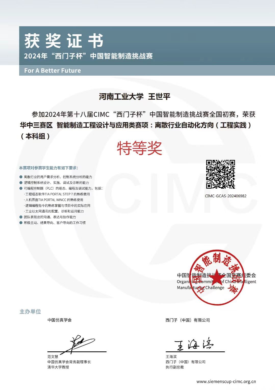 “西门子杯”中国智能制造挑战赛是在教育部与西门子公司战略合作框架下的一项国家级A类赛事,为响应国家“中国制造2025”计划、培养和储备中国智能制造领域工程人才、促进中国制造业在工业自动化、信息化、数字化和智能化的产业升级等方面而设立。2019年,大赛被纳入全国高校学科竞赛排行榜评估竞赛项目,是目前国内智能制造领域规模最大的学生类竞赛之一。
