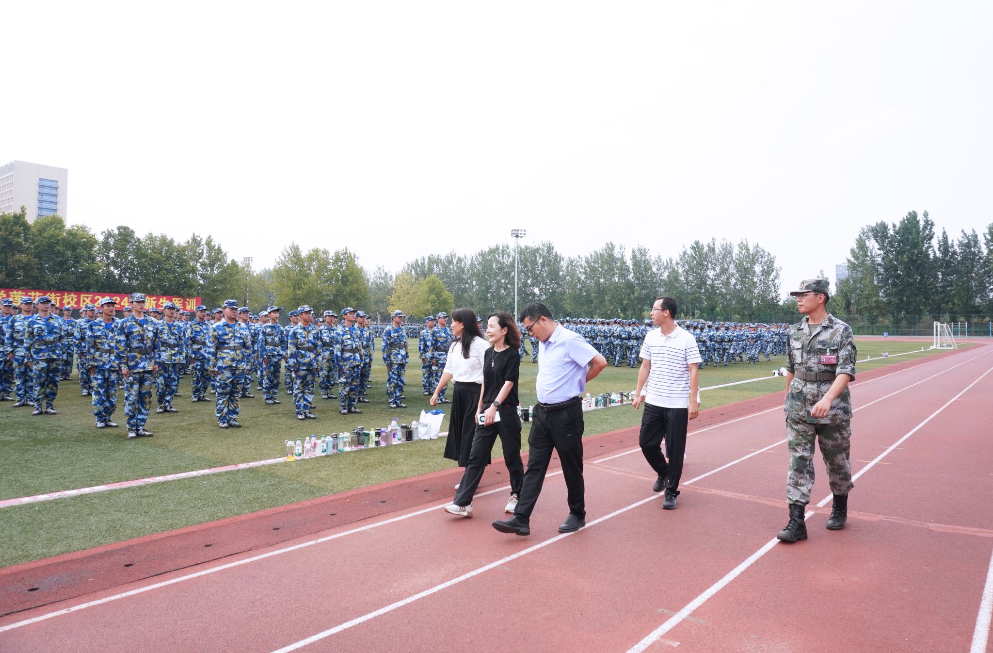 领导老师逐一走访了军训的各个方阵,与教官们亲切交谈,军训教官总负责人赵昱涵汇报了近期新生训练的整体情况。
