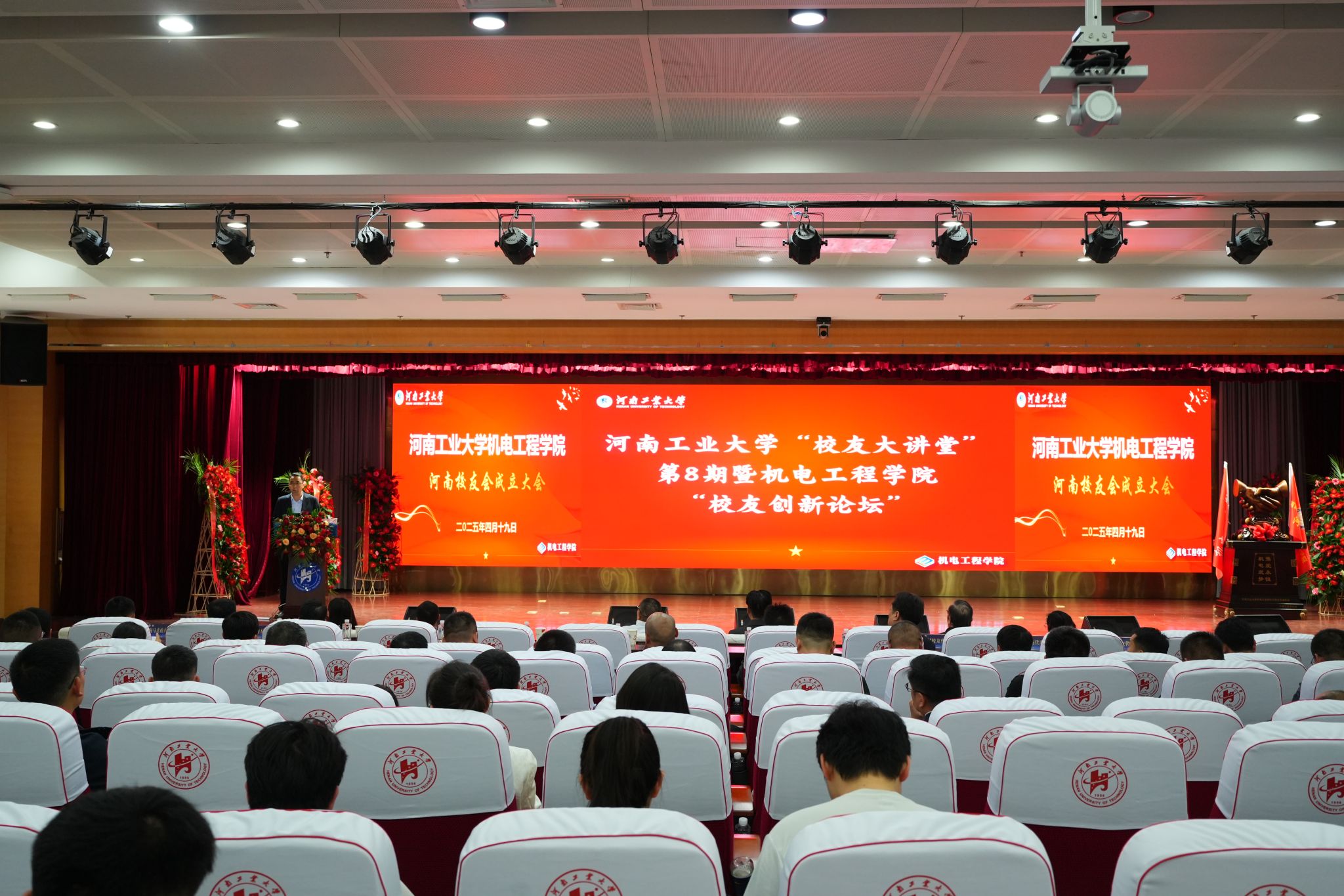 长)以《基于经济下行压力下的商业模式顶层设计》为题,从宏观经济视角切入,解析新时代商业逻辑重构路径;吴子丹(粮机77级,原国家粮食局副局长)聚焦粮食安全战略,分享《绿色智慧仓储与物流技术》;王伟(机械87级,中国机械总院郑州机械研究所副总经理)以《强固产业基础,建设制造强国》为主题,揭示制造业创新发展密码;李留纪(机械88级,郑州鼎力集团创始人)结合企业实践,阐述《当前环境下企业如何突围》;王建勋(机械90级,北京塞微科技创始人)带来《智能网联车路云三维数字孪生应用介绍》,展现科技赋能产业的生动实践;任学良(机械01级,TCL格创东智副总裁)以《企业数字化实践及其数字化人才》为题,解读智能制造时代的人才需求变革;刘晓东(过控12级,郑州金谷粮食机械智能装备事业部总经理)分享《全自动散料打包、发放系统在粮油行业的应用》,呈现青年校友的创新活力。思想碰撞激发共鸣 构建产学研融合新生态。报告中,校友们既回溯在母校求学时的科研启蒙,又结合行业发展痛点提出解决方案,更寄语学弟学妹要保持对技术的敬畏、对创新的执着。