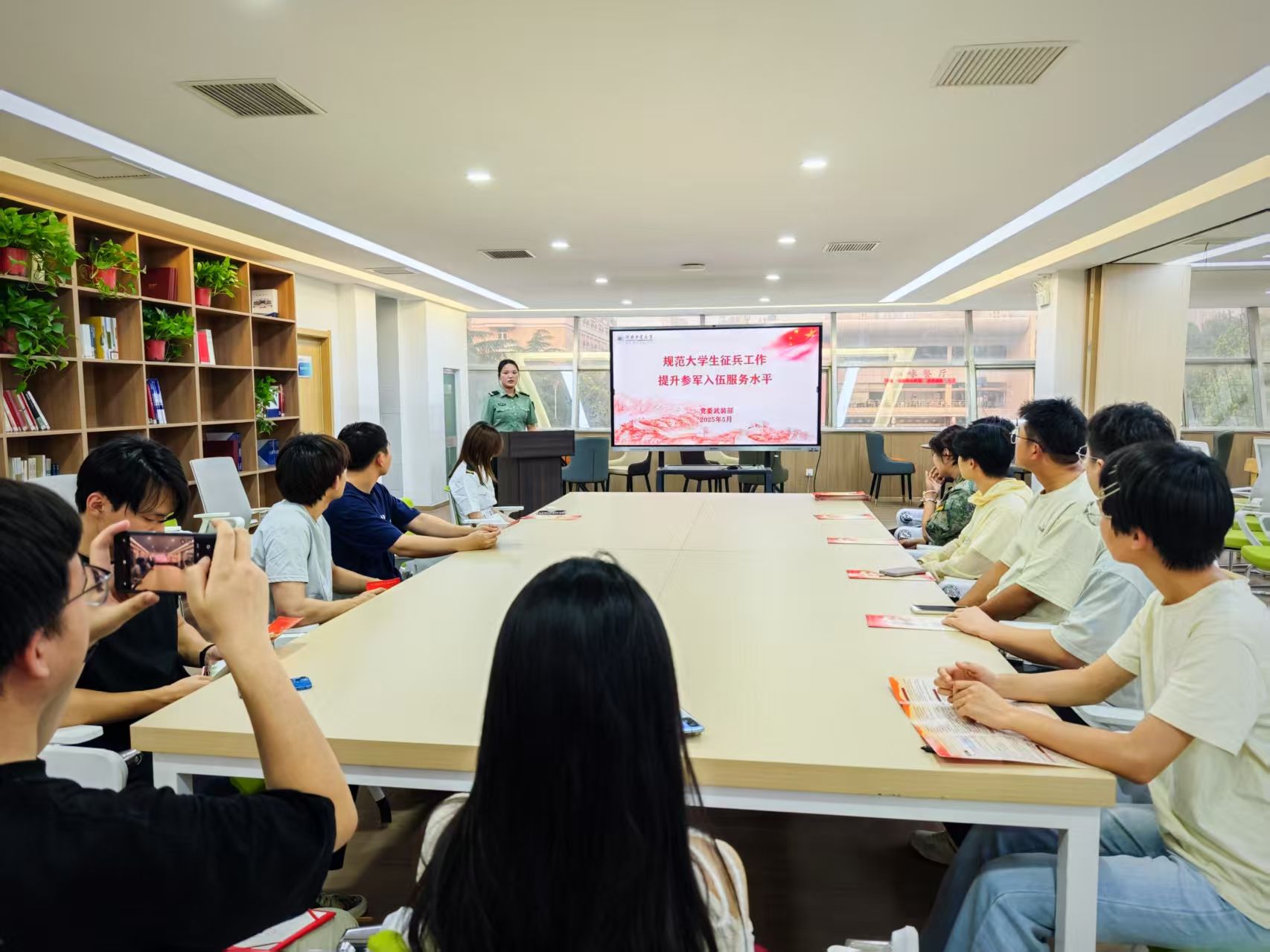 武装部征兵宣讲团成员现场宣讲,毕业班辅导员杨贞贞、有意向应征入伍的2025届毕业生同学参加了会议。
