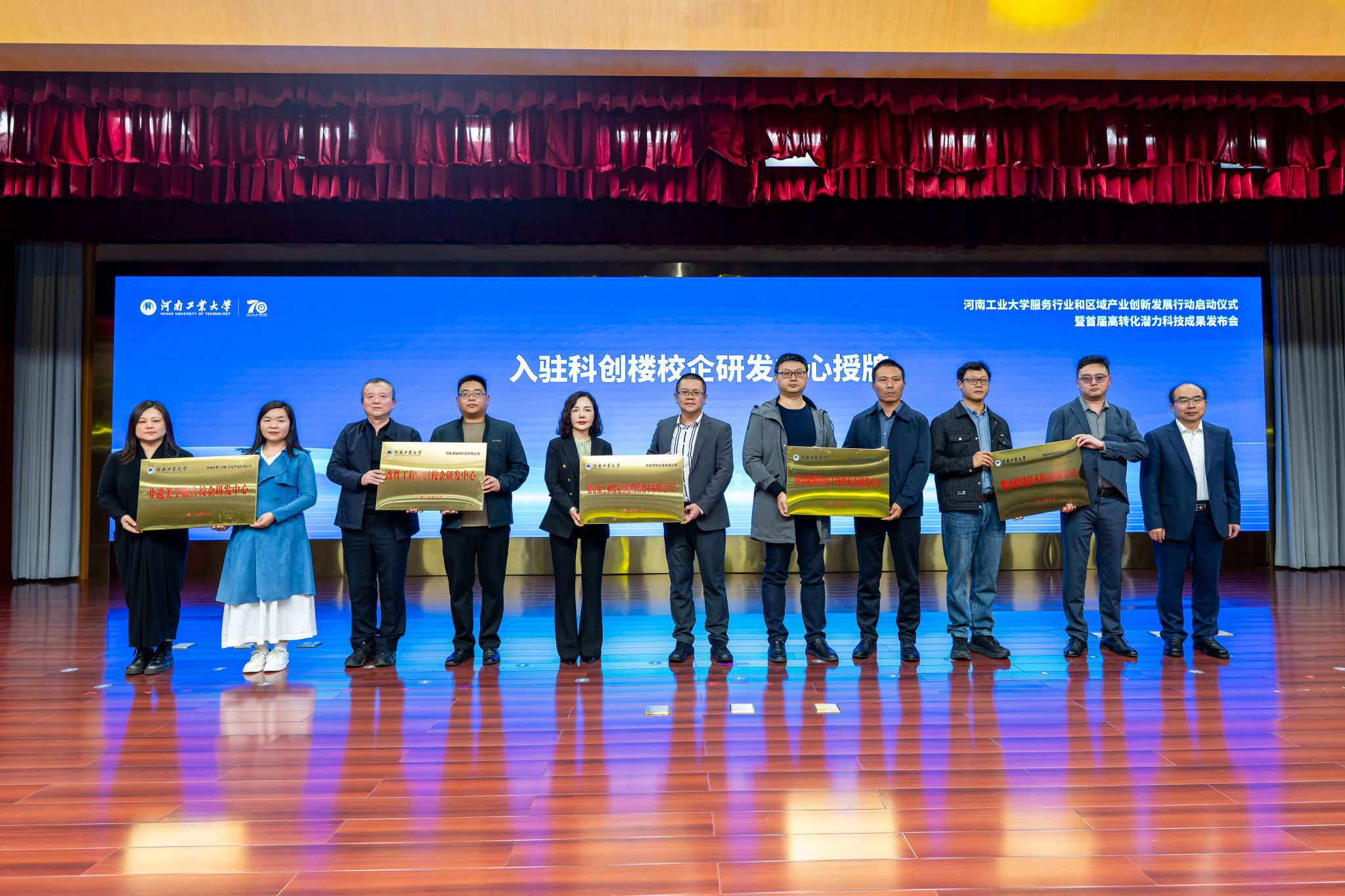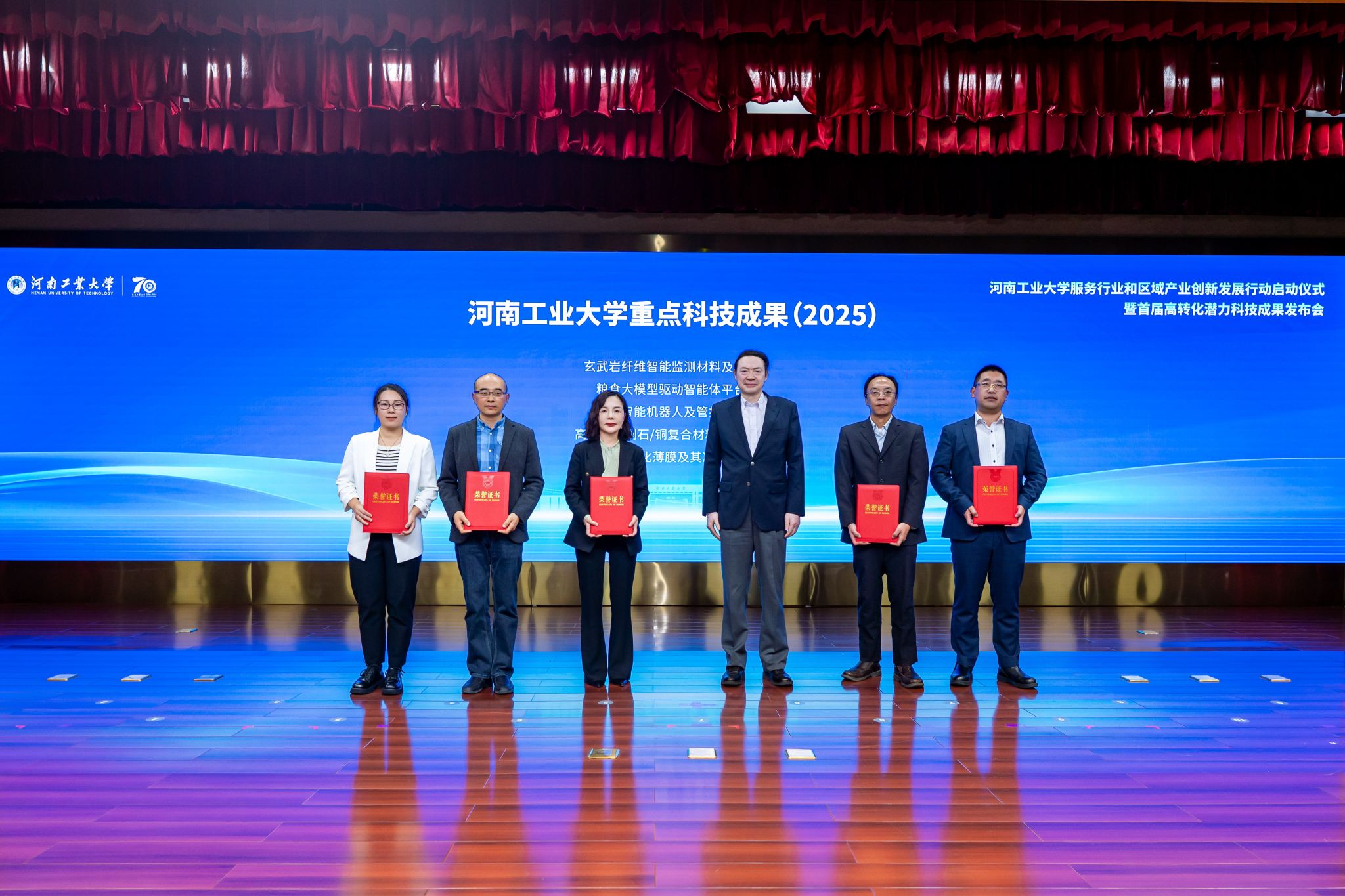 发布会上,院长吴兰领衔的智能无人系统及装备团队带来了重磅成果——“粮食智能机器人及管控系统”。该系列成果聚焦粮食产后安全与智能化管理核心需求,涵盖粮仓管控人形机器人、智能平粮机器人、粮食装备智能管控系统等关键产品,凭借明确的应用场景、高成熟度的技术体系,具备极强的产业化落地前景。其中,“粮宝二号”粮仓管控人形机器人现场登台互动,赢得了现场嘉宾与观众的广泛关注和高度赞誉。校长吴智深为团队颁发荣誉证书,对其在科技成果转化领域作出的突出贡献给予充分肯定。