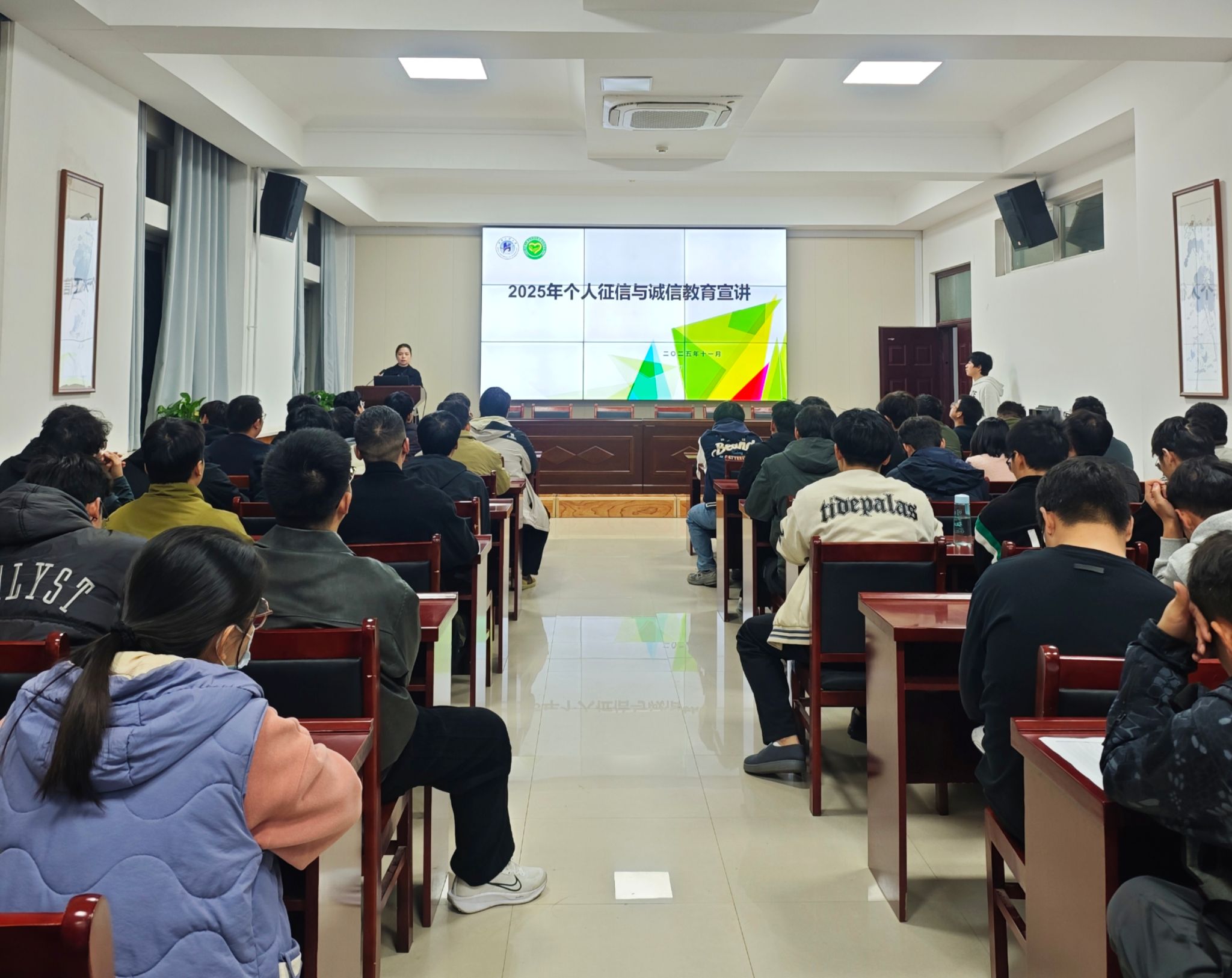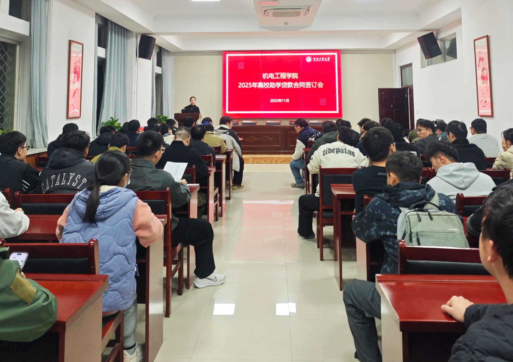 于11月3日在7224捷赛厅举行2025年高校贷款合同签订暨感恩励志教育宣讲会。资助负责老师冯晨晨、资助助理及全体高校贷款学生参加会议。