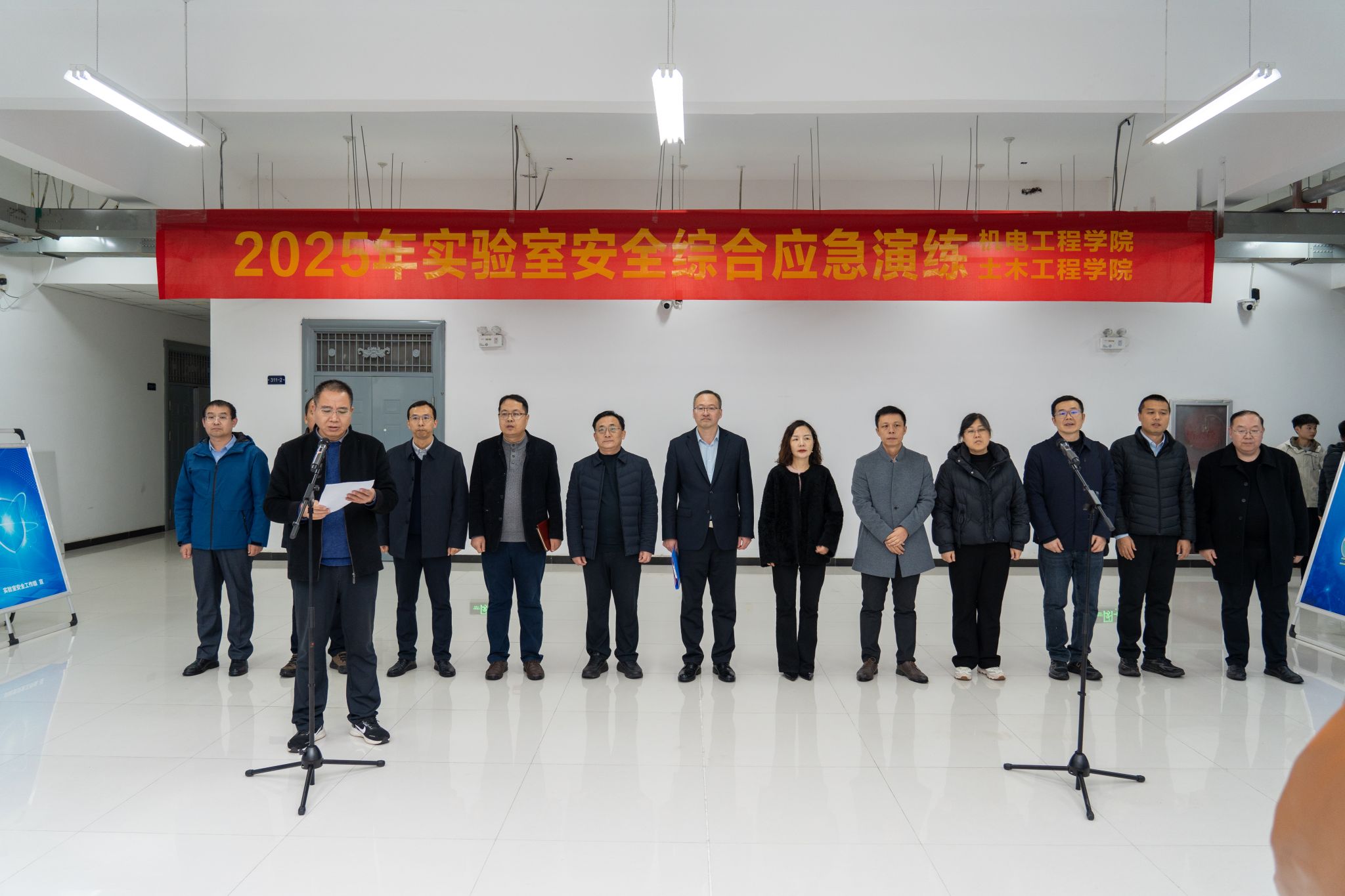 院长吴兰详细介绍了演练的背景、目标及流程,强调实验室安全是教学科研工作的底线保障。结合“全国119消防宣传月”与冬季消防安全特点,保卫处副处长李芳炎提醒师生严守安全规定,离开实验室“三清三关”,畅通安全通道、熟悉消防设施、掌握逃生技能。邓淼磊指出,应急演练是提升安全防护能力的关键举措,要求全体参演人员以实战心态投入演练,切实掌握应急技能,并宣布演练正式开始。