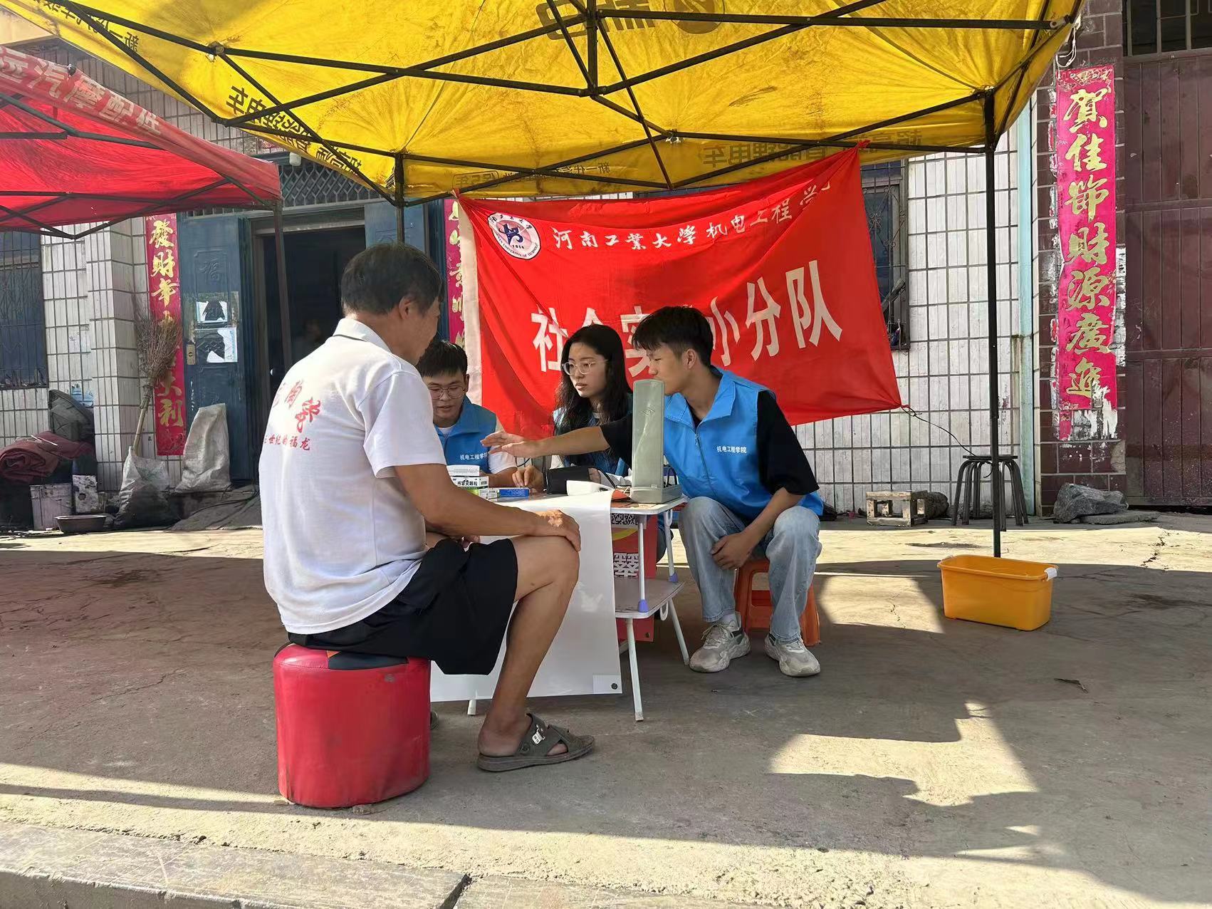 “健康护航”实践团队经过培训,在村口设立爱心医疗服务站点,开展了为期一周的医疗和健康宣传服务。队员们免费给乡亲们测量血压、血糖,发放暑期防暑降温健康知识宣传手册,并在站点准备了感冒灵、芬必得、布洛芬、连花清瘟胶囊等一系列常用非处方药物,在炎炎夏日为乡亲们送来一份健康,一丝清凉。