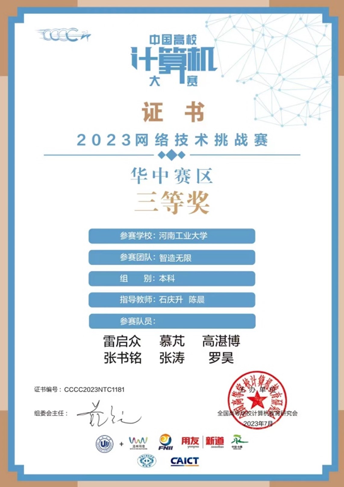 教师石庆升、陈晨指导的雷启众、慕芃、高湛博、张书铭、张涛、罗昊六位本科生组成的“智造无限”团队取得了突破,荣获华中赛区三等奖。