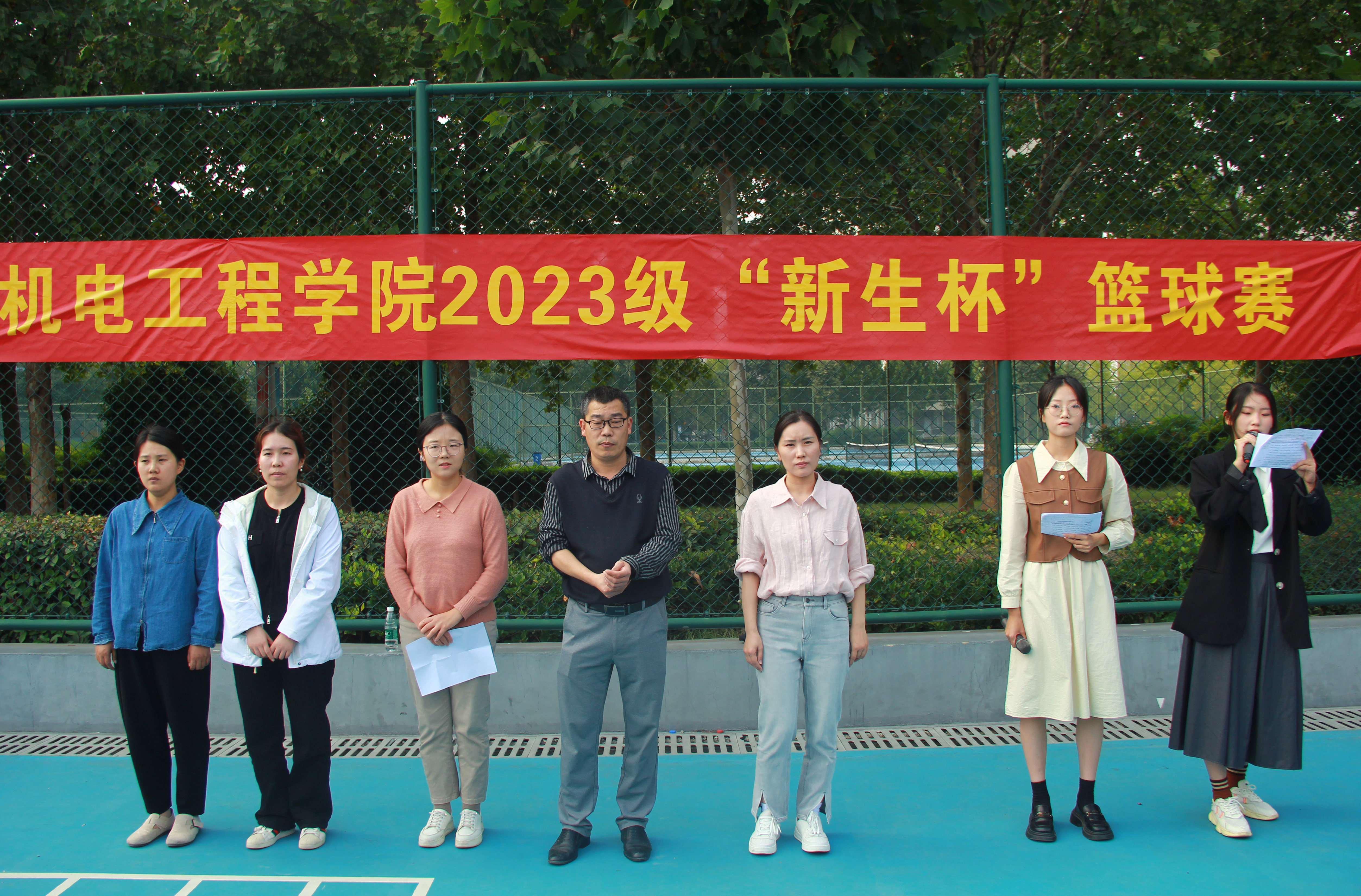 2023年10月17日中午,凤凰体育 2023级“新生杯“篮球赛在莲花街校区西篮球场拉开帷幕。院学工办主任刘伟杰、团委书记丁晶晶、全体辅导员、裁判员、运动员和工作人员参加了开幕式。