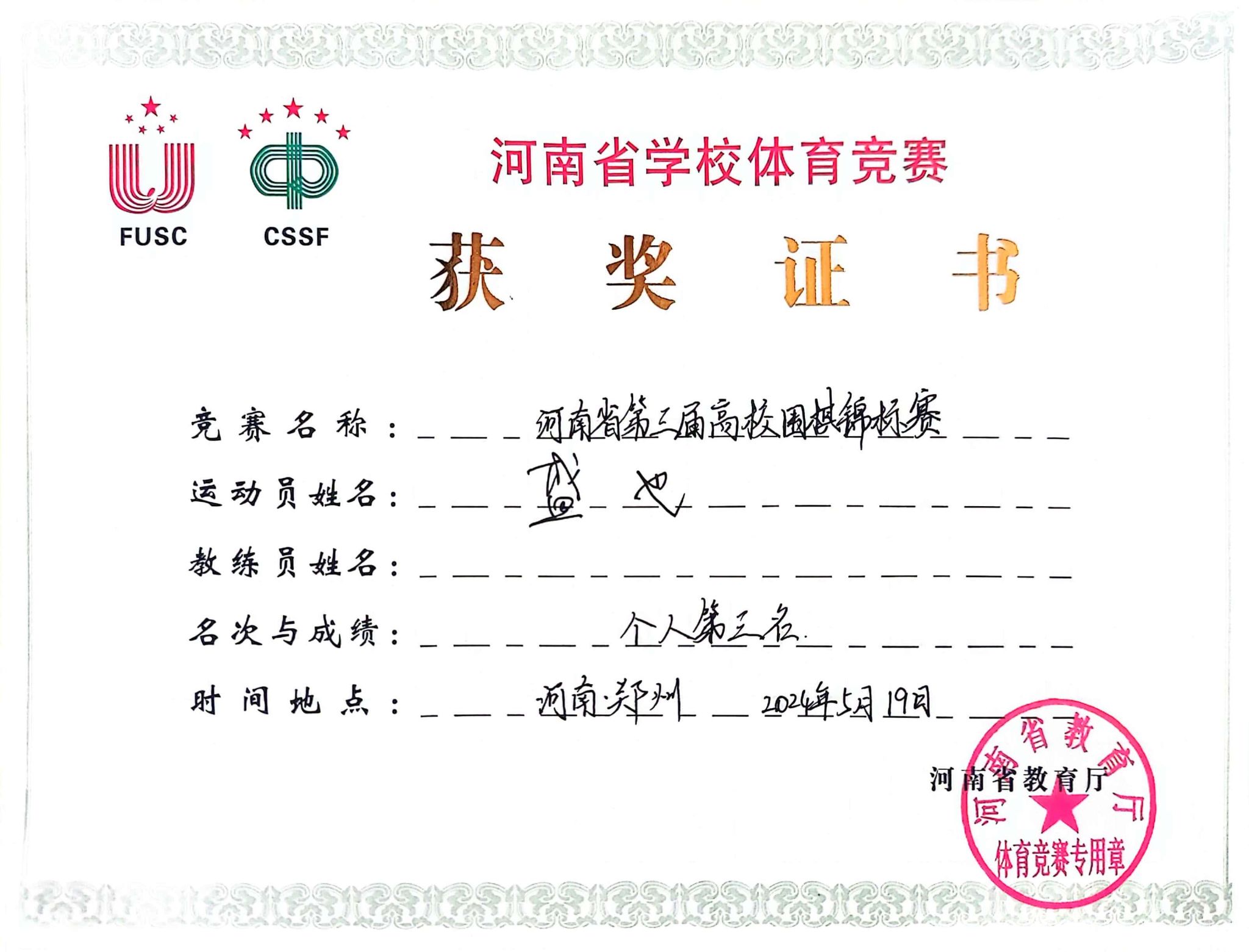 5月18日至19日,河南省第三届高校围棋锦标赛在河南郑州如期举行。经过两天七轮的紧张而激烈的角逐,凤凰体育 盛也沉着应对、睿智思考、落子无悔,最终荣获学生组个人季军的好成绩。