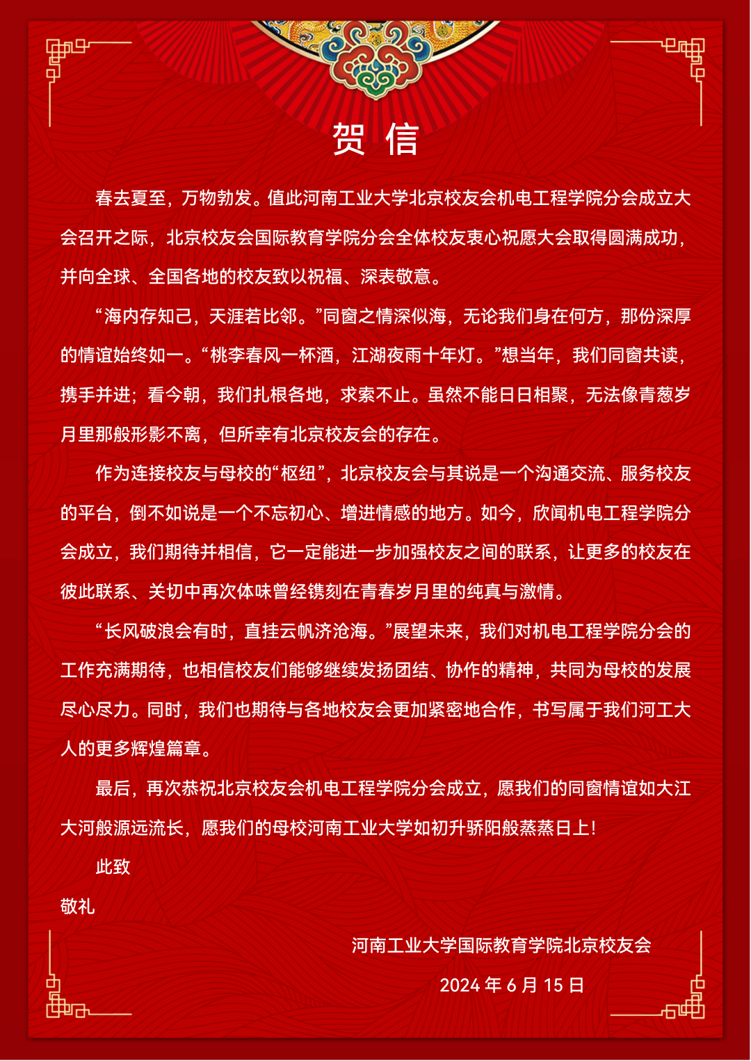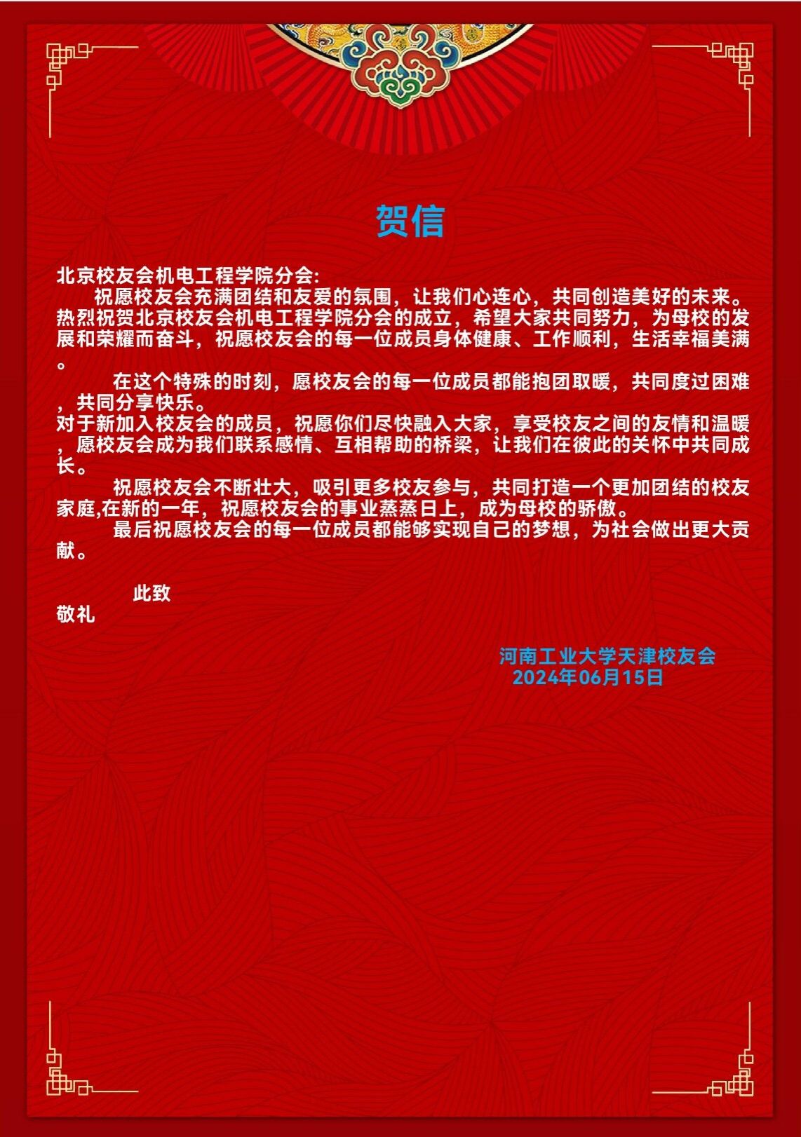 北京校友会的成立表示祝贺。