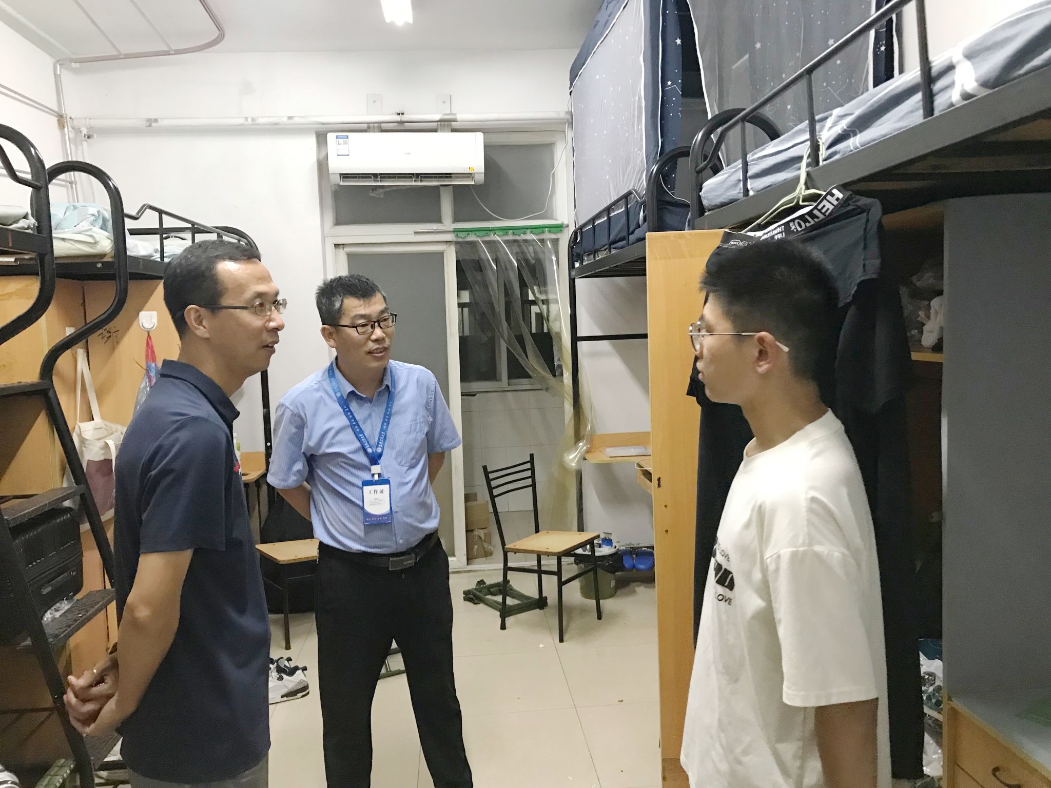 党委书记魏涛、党委副书记张东霞带领新生辅导员、班主任、班级助理辅导员深入学生宿舍看望慰问2024级新生,与同学们展开亲切交流,详细询问同学们家庭基本情况,解答他们关于学习、生活的疑难困惑,并重点强调了“防骗”相关安全事项。