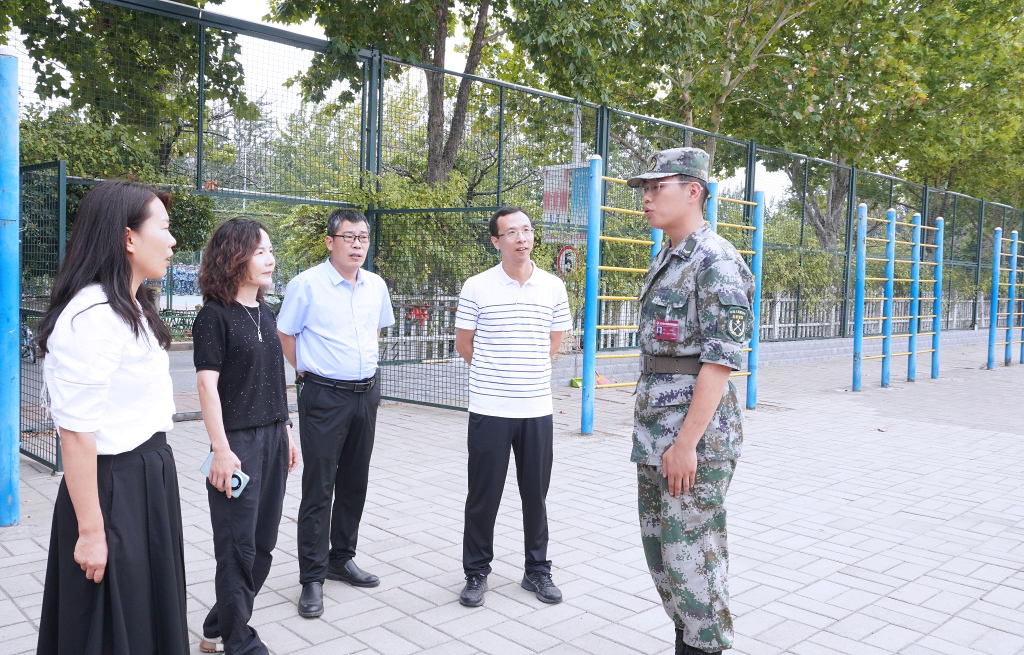 领导老师逐一走访了军训的各个方阵,与教官们亲切交谈,军训教官总负责人赵昱涵汇报了近期新生训练的整体情况。