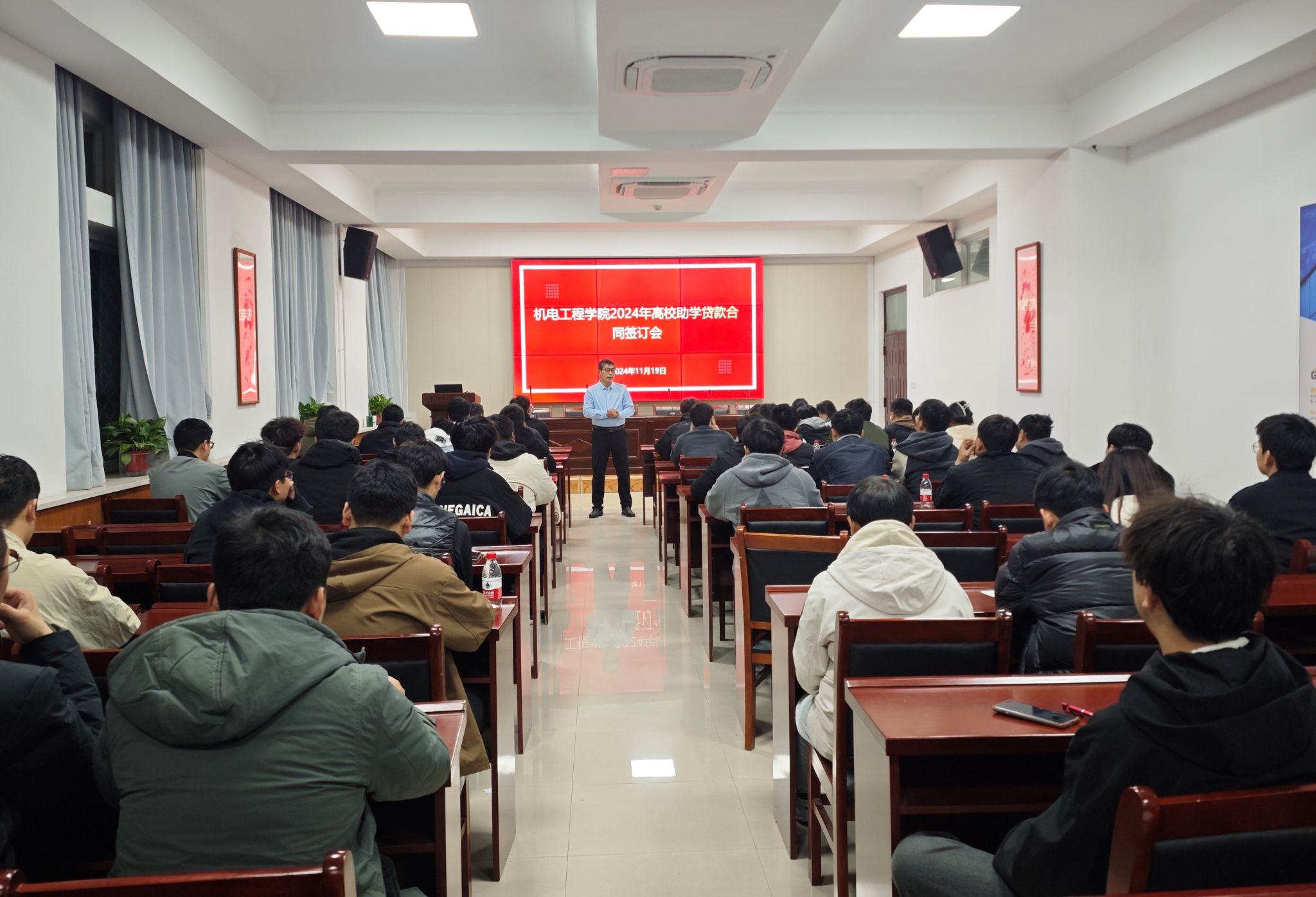 于7224捷赛厅举行了2024-2025学年高校贷款合同签订暨感恩励志教育大会。学工办主任刘伟杰、辅导员赵琳琳、资助助理以及申请高校贷款的学生参加会议。