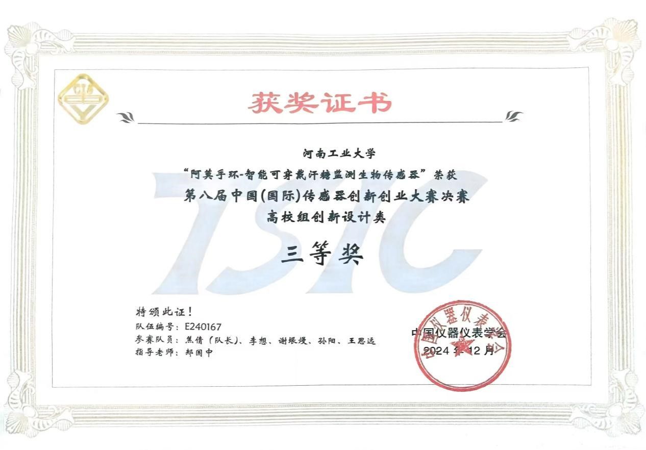 郏国中老师指导的“阿莫手环”项目最终荣获第八届中国(国际)传感器创新创业大赛决赛三等奖。