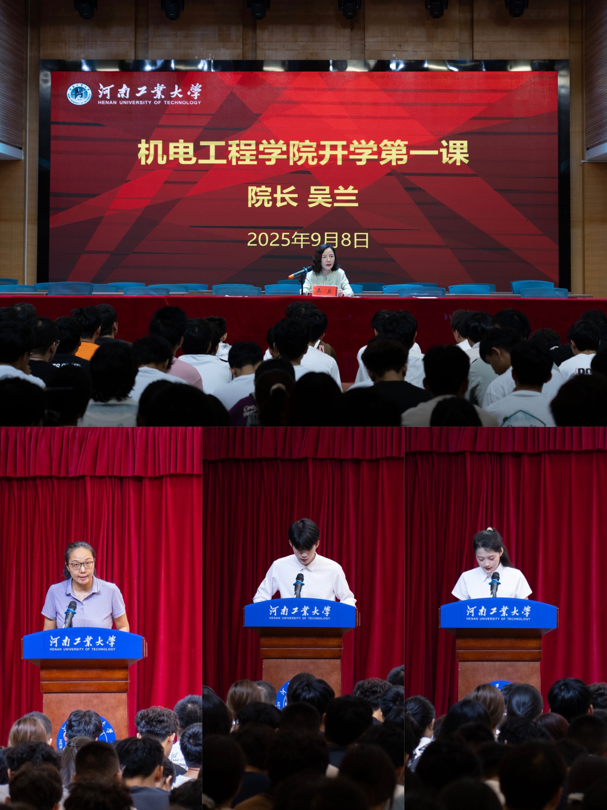 领导班子全体成员、各科室(系)主任、新生班主任、全体辅导员以及全体2025级本科新生参加活动。典礼由党政办副主任邱慧主持,现场气氛庄重而热烈。优秀老生代表智造2402班李鹏飞分享了自己的大学成长经验,激励新生积极进取;新生代表机制2506班王凯露满怀憧憬地表达了对大学生活的期待与决心;教师代表蒋林老师则以专业的视角和殷切的期望,为新生送上了宝贵的建议。最后,院长吴兰以《奋进新征程,书写新篇章》为题讲授“开学第一课”,通过回顾凤凰体育