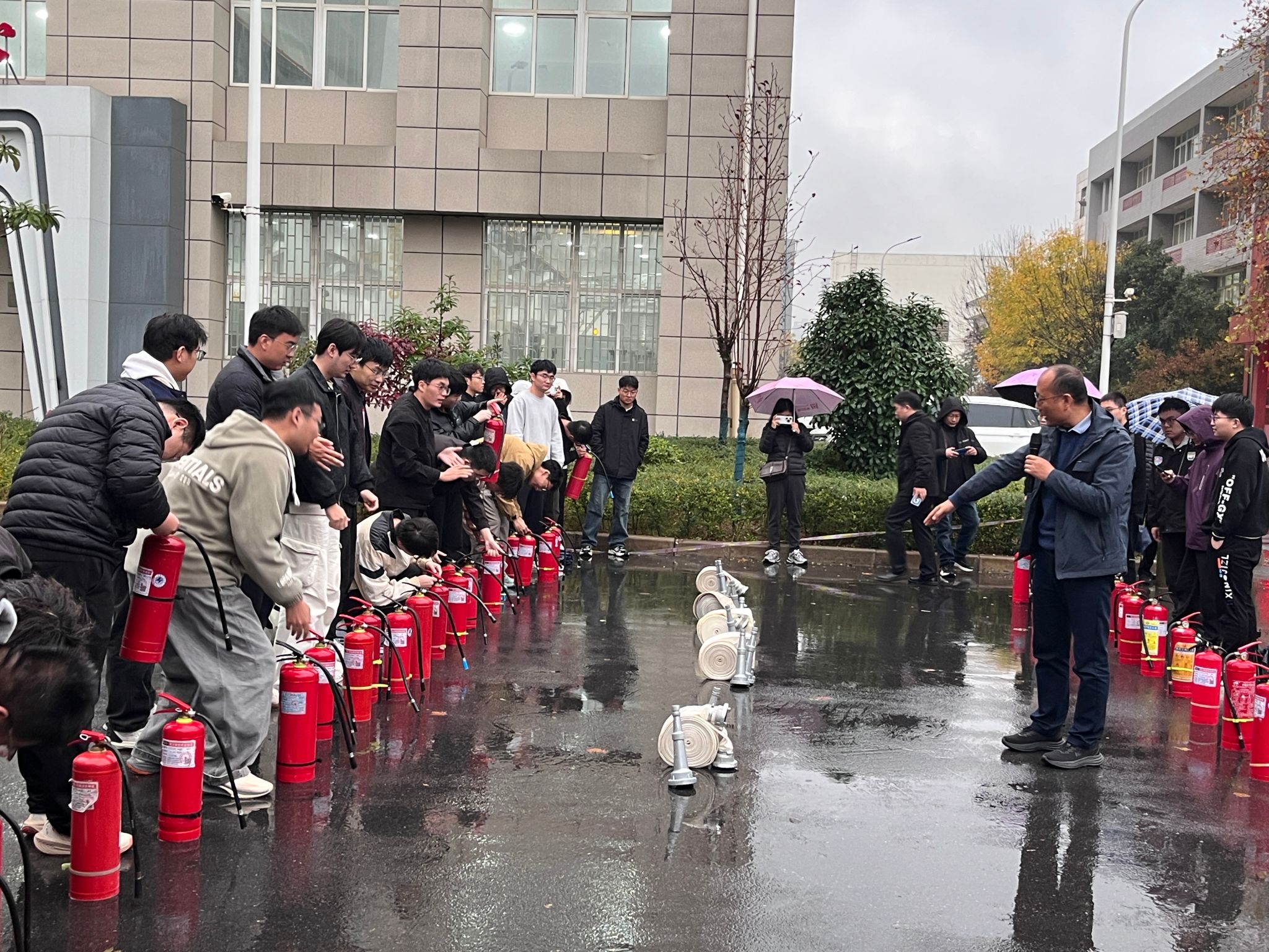 院长吴兰详细介绍了演练的背景、目标及流程,强调实验室安全是教学科研工作的底线保障。结合“全国119消防宣传月”与冬季消防安全特点,保卫处副处长李芳炎提醒师生严守安全规定,离开实验室“三清三关”,畅通安全通道、熟悉消防设施、掌握逃生技能。邓淼磊指出,应急演练是提升安全防护能力的关键举措,要求全体参演人员以实战心态投入演练,切实掌握应急技能,并宣布演练正式开始。