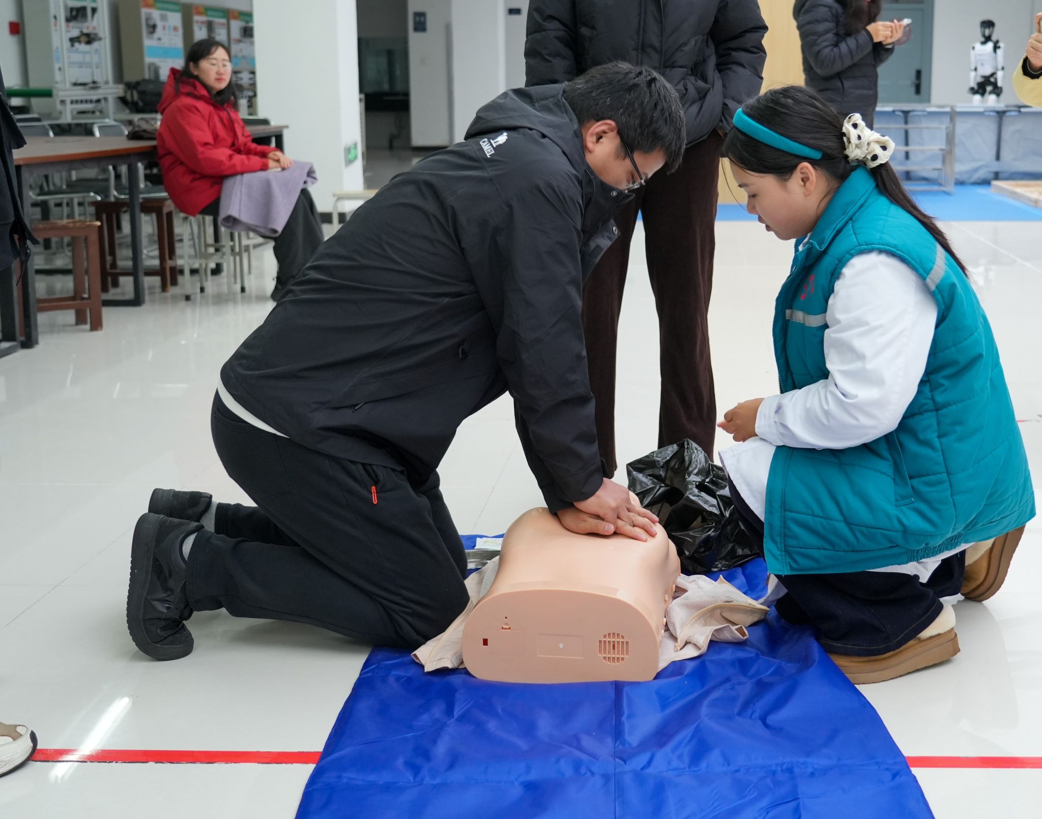 医疗急救培训环节,校医院陈辉医生结合案例讲解触电、烫伤理、机械损伤处置及心肺复苏技术,明确应急处置规范。师生分组模拟事故场景实操,现场配备4具人体模型保障人人掌握核心急救技能。消防演练环节,校保卫处消防科孙志华开展消防知识培训,涵盖火灾报警、初期扑救技巧及紧急逃生要点;随后模拟火灾疏散,参演师生沿安全楼梯迅速撤离至东门广场,疏散后设置二十余个灭火器实操点,指导师生掌握灭火器材正确使用方法。
