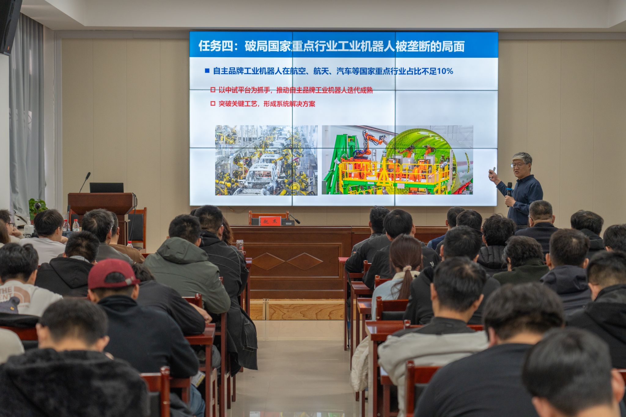 报告会上,赵杰教授结合自身深耕机器人领域的研究经验,运用详实的数据和生动的案例,围绕“工业机器人发展态势”与“人形机器人热点解析”两大板块展开系统分享。他从当前形势研判、技术发展趋势、重点研究领域等几方面,深入阐释了我国机器人发展面临的新变化与新挑战,同时就机器人产业链构建、产业基础能力提升、核心竞争力培育及未来国际竞争战略格局等关键内容进行详细论述。