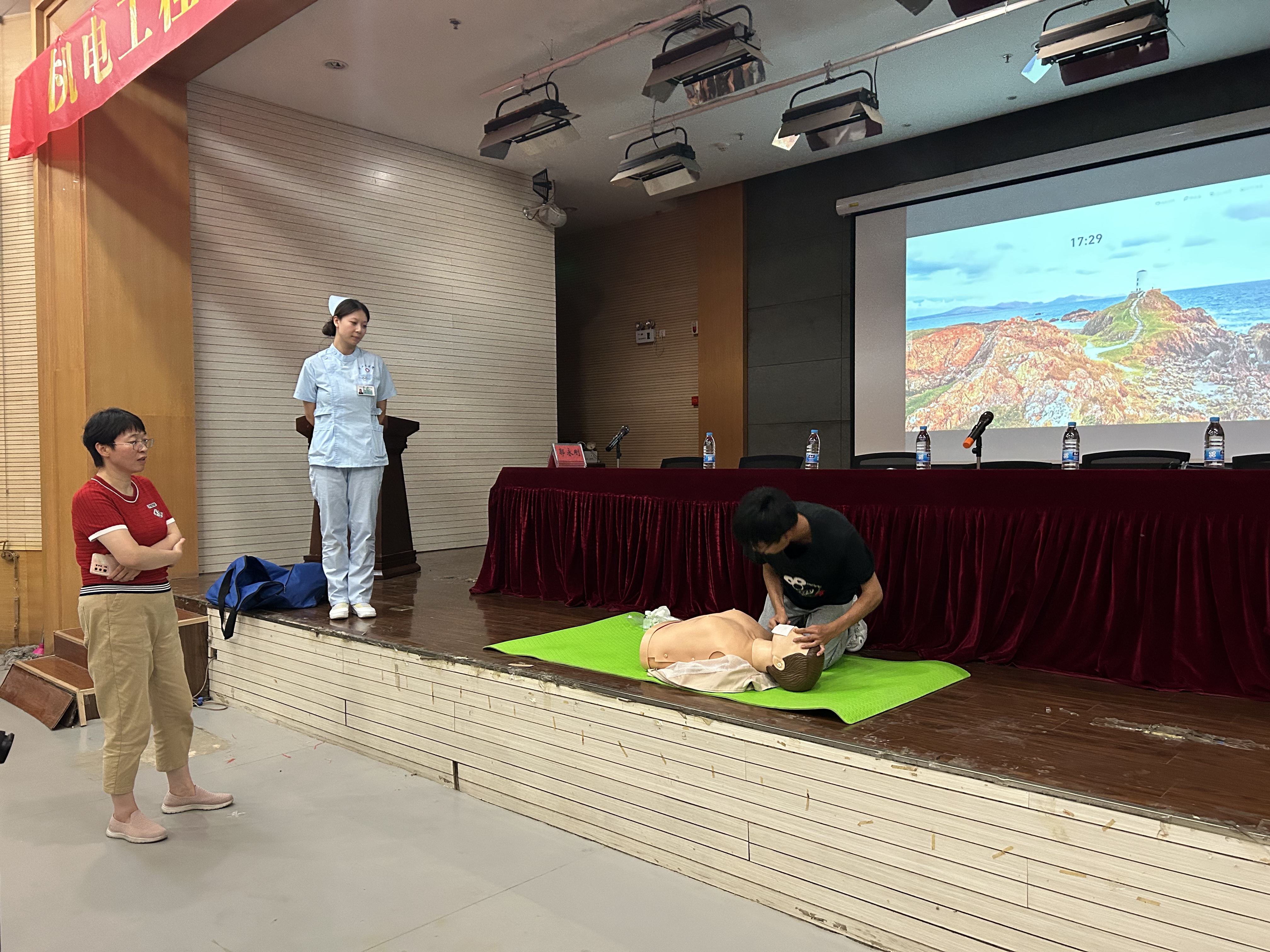 邀请校医院医务科科长陈辉进行健康知识讲座,普及急救常识。现场医务人员详细讲解了实施心肺复苏的方法,规范示范了打开气道、实施胸外心脏按压和人工呼吸的动作要领,并现场使用模拟人逐步进行演示。