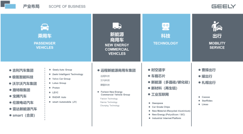 吉利控股集团致力于成为具有全球竞争力和影响力的智能电动出行和能源服务科技公司,业务涵盖汽车及上下游产业链、智能出行服务、绿色运力、数字科技等。集团总部设在杭州,旗下吉利、领克、极氪、几何、沃尔沃、极星、路特斯、LEVC、远程新能源商用车、雷达新能源汽车、优行科技等围绕各自品牌定位,积极参与市场竞争。集团以汽车产业电动化和智能化转型为核心,在新能源科技、共享出行、车联网、智能驾驶、车载芯片等前沿技术领域,打造科技护城河,做强科技生态圈。