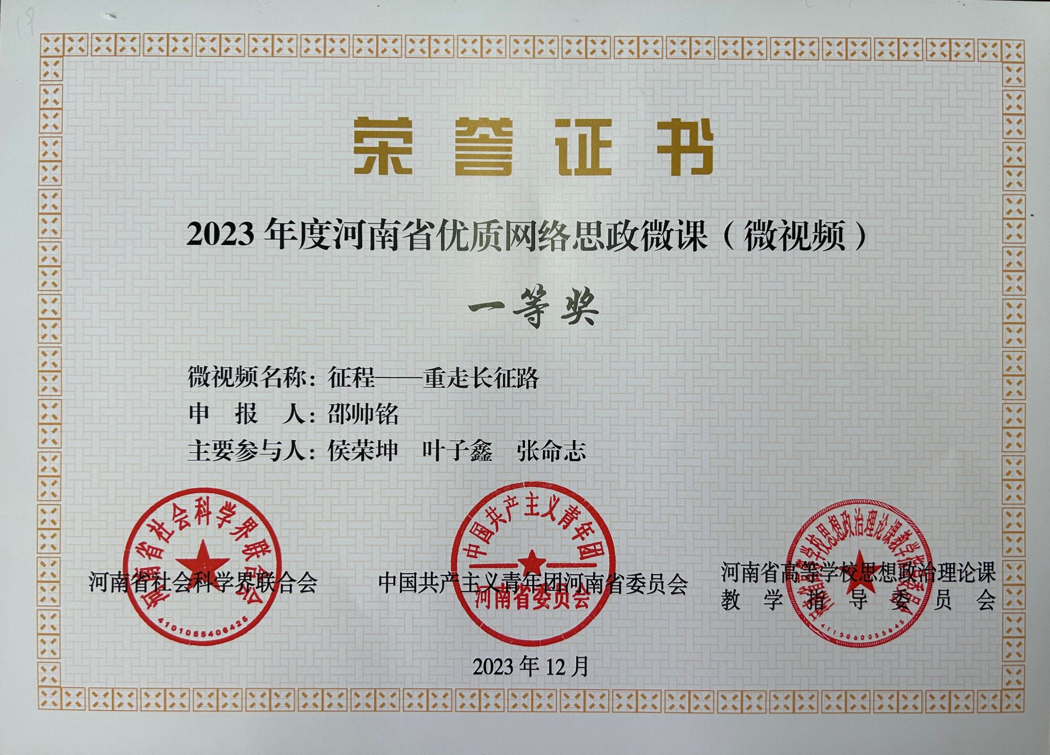 近日,河南省社会科学界联合会公布了2023年度河南省优质网络思政微课(微视频)获奖名单。在此活动中,由凤凰体育 张小彩、丁晶晶老师指导,邵帅铭、侯荣坤、叶子鑫、张命志同学参与创作的《征程——重走长征路》作品荣获省优质网络微视频一等奖。