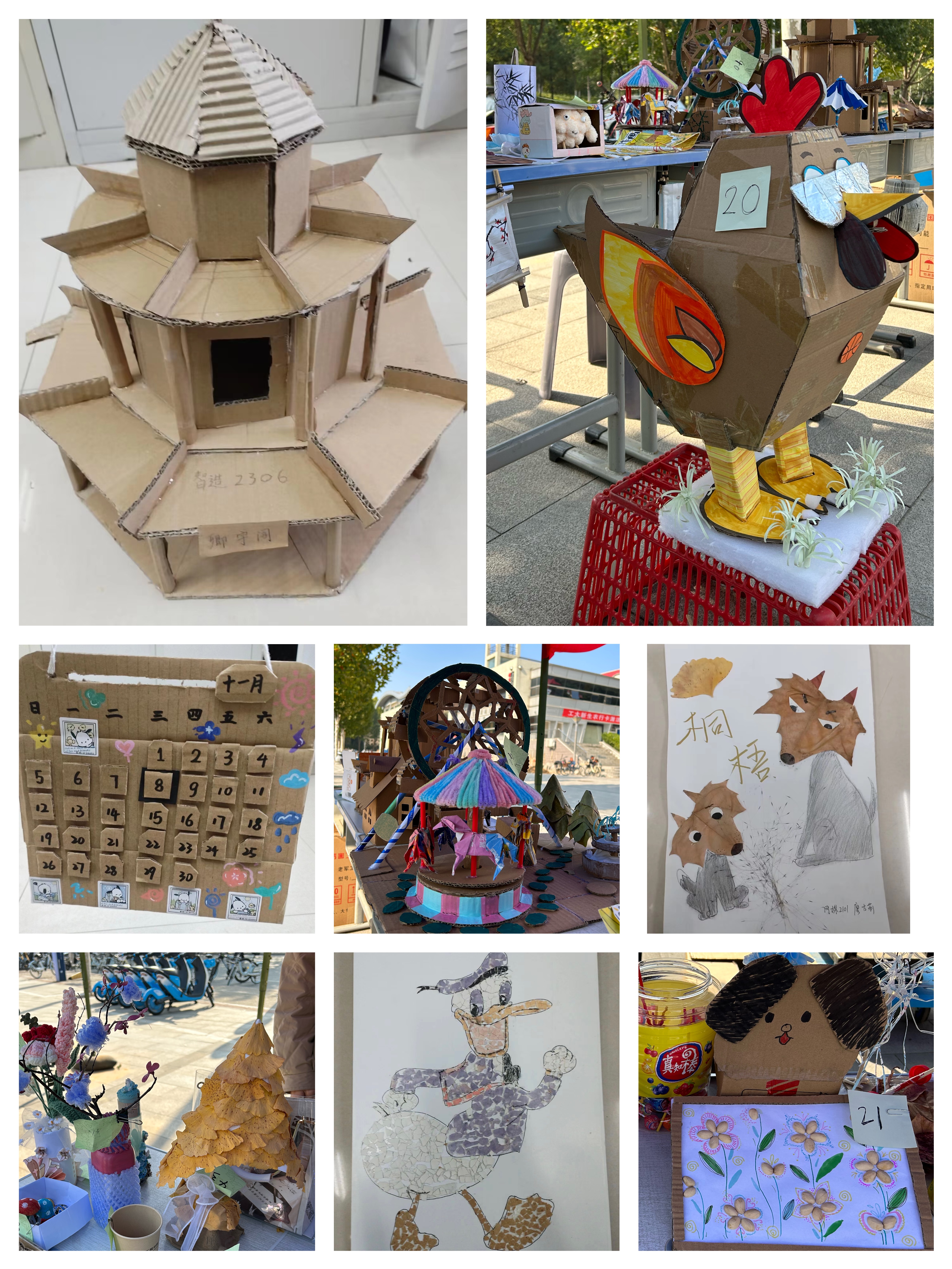在为期一周的前期作品征集活动中,同学们踊跃报名,积极参与。工大学子用智慧的头脑和充满创造力的双手,让废纸板、饮料瓶、枯木枝、口罩等废旧物品崇焕生机,创作出了精巧绝伦、别出心裁的手工艺作品。