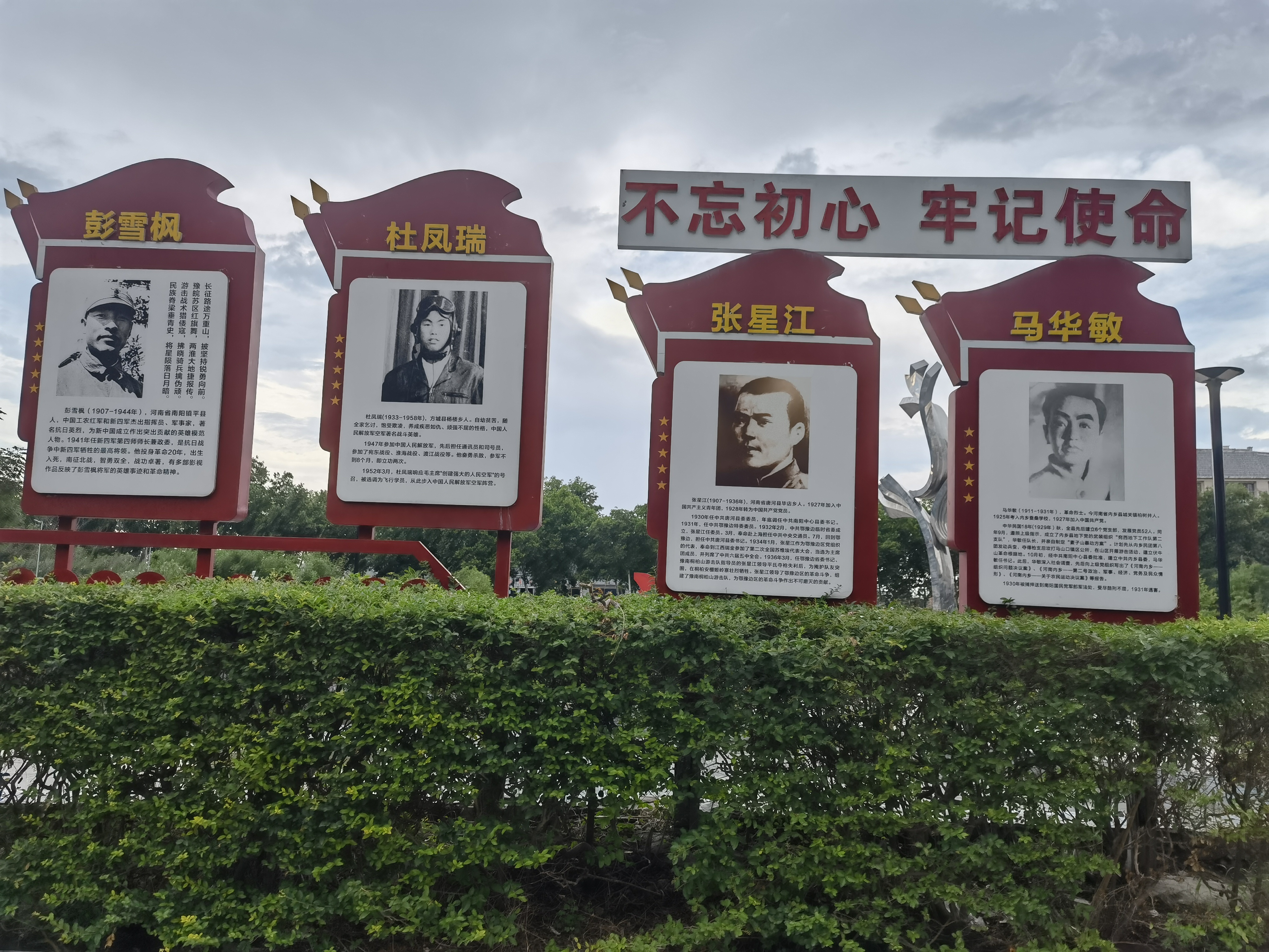 广场四处伫立着红色人物纪念碑,我仔细阅读和学习着先辈们的事迹和精神:抗日战争中新四军牺牲的最高将领彭雪枫元帅,一等功空军英雄杜凤瑞。望着上面的一位位功勋赫赫的家乡英烈,我了解了先辈革命的艰苦历程,深深的感受到了当今生活的来之不易,更加珍惜现在的和平与繁荣,我们美好的今日就是革命前辈们无私奉献的续集和坚定爱国之心。