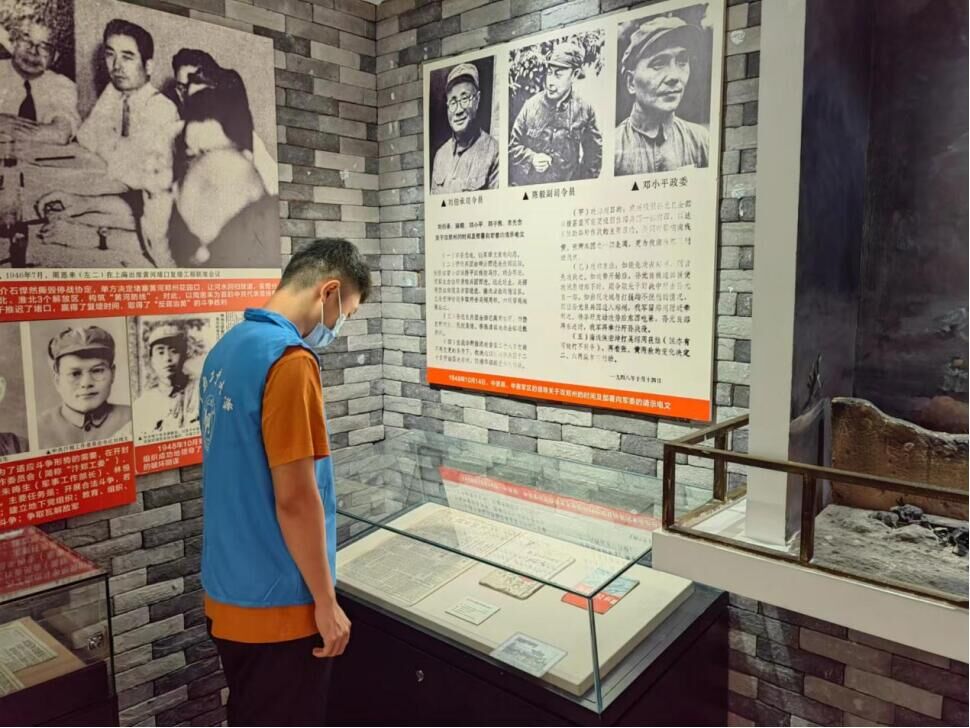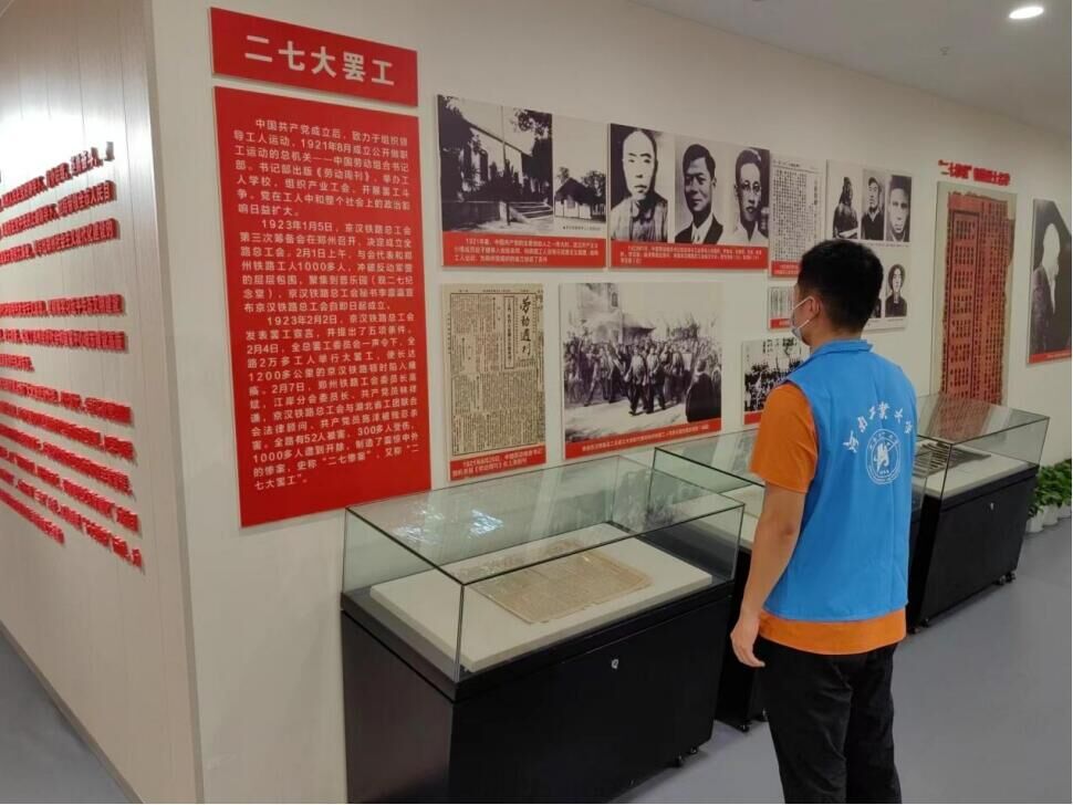 队员参观党革命历史遗物 接着走下去,我了解到郑州所留下的红色历史足迹,中国共产党成立后,致力于组织领导工人运动,二七大罢工便是其中一件。