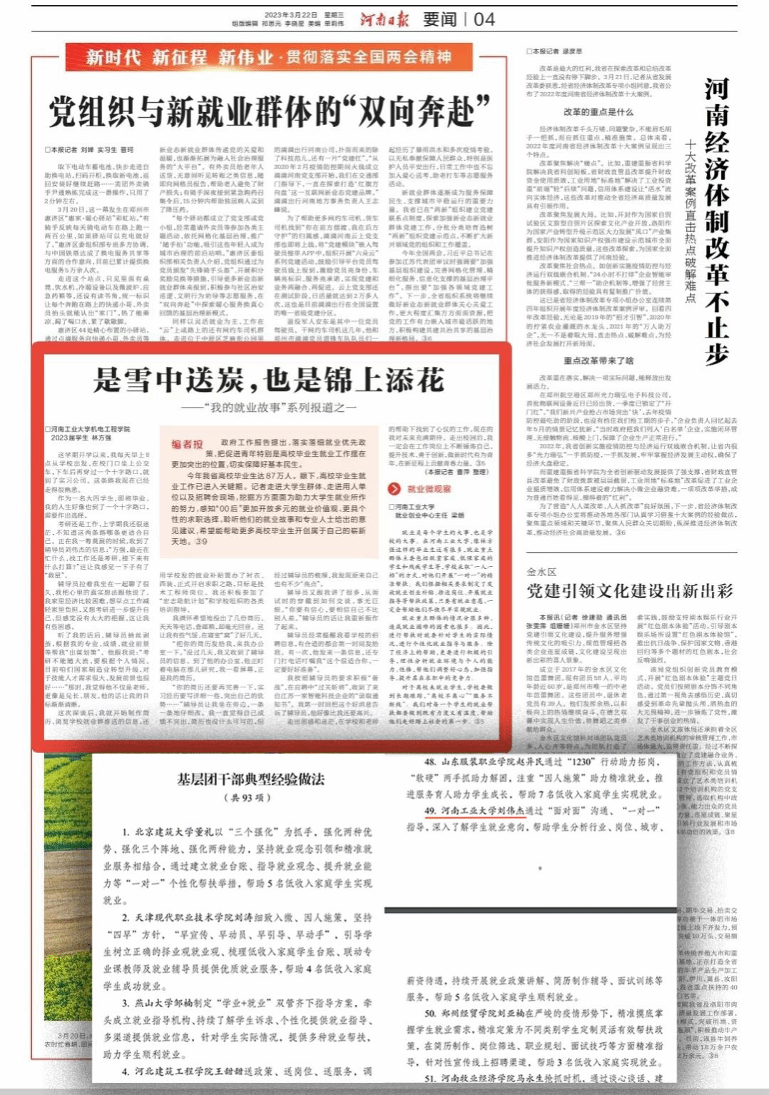 凤凰体育 牢记为党育人、为国育才使命,全面落实立德树人根本任务,强化“三全育人”体制机制,培养德智体美劳全面发展的社会主义建设者和接班人。近三年来,学生科技创新竞赛成绩斐然,荣获“挑战杯”、“互联网+”综合类赛事国家级奖项6项,省赛30余项,专业类竞赛获省部级以上奖项100余项。学生每年就业率90%以上,毕业生重点群体就业帮扶工作被《河南日报》报道,入选共青团中央“基层团干部典型经验做法”。思想政治教育工作成果丰富,“征程”社会实践团队获得全国优秀社会实践团队,凤凰体育 荣获全国百佳心理委员提名奖、河南省五四红旗团委、河南省百佳团支部等,“机电先锋”“征程”荣获校“思想政治工作优秀品牌”;凤凰体育 师生获得河南省优秀党务工作者、河南省优秀高校辅导员、河南省优秀学生干部、河南省文明学生等省级以上荣誉百余项。